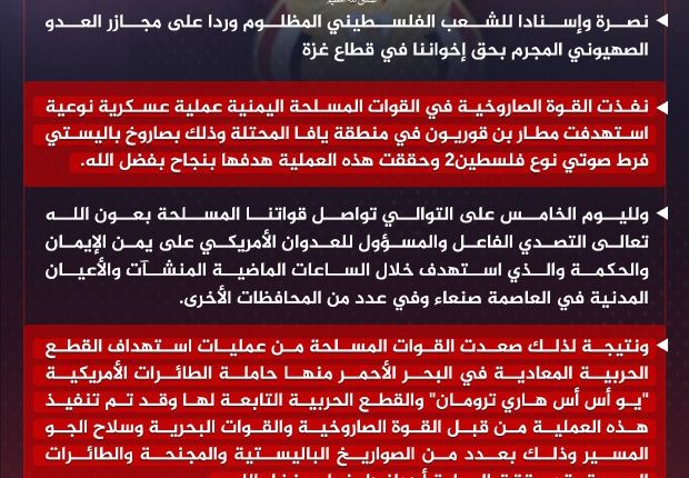 بيان القوات المسلحة بشأن عملية عسكرية استهدفت مطار بن قوريون واستهداف حاملة الطائرات الأمريكية