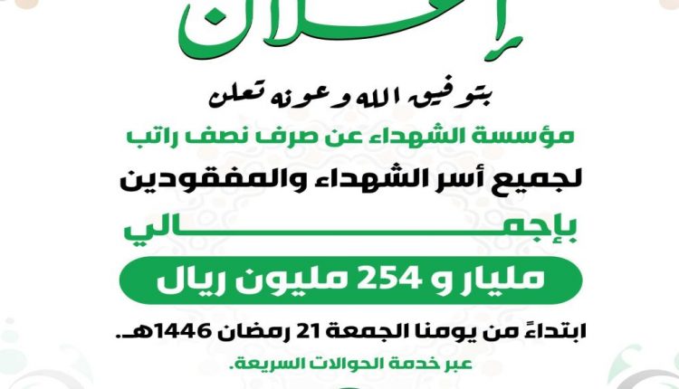 أعلنت مؤسسة الشهداء لرعاية وتأهيل أسر الشهداء اليوم عن صرف نصف راتب شهر لجميع أسر الشهداء والمفقودين بإجمالي مليار و254 مليون ريال.