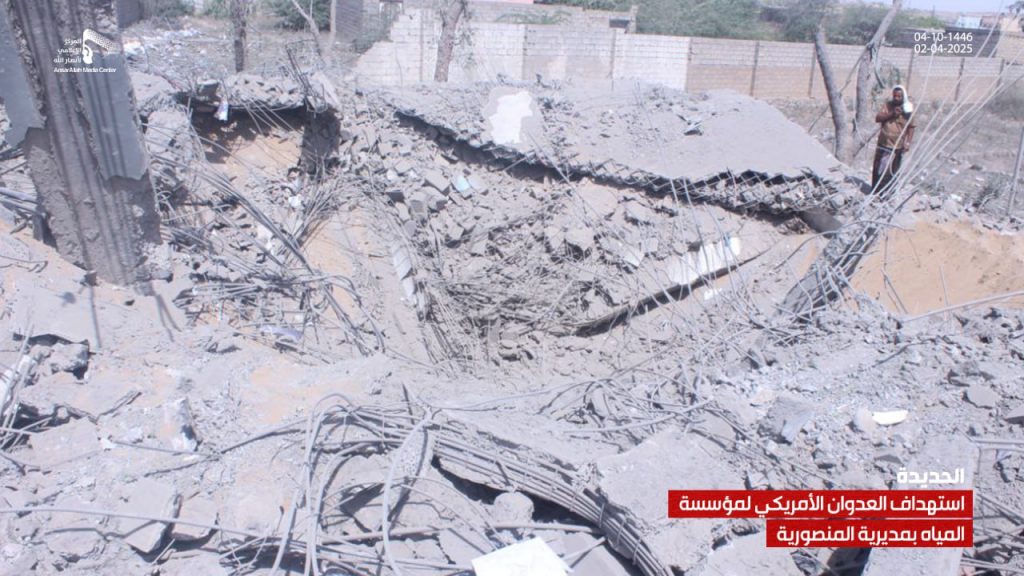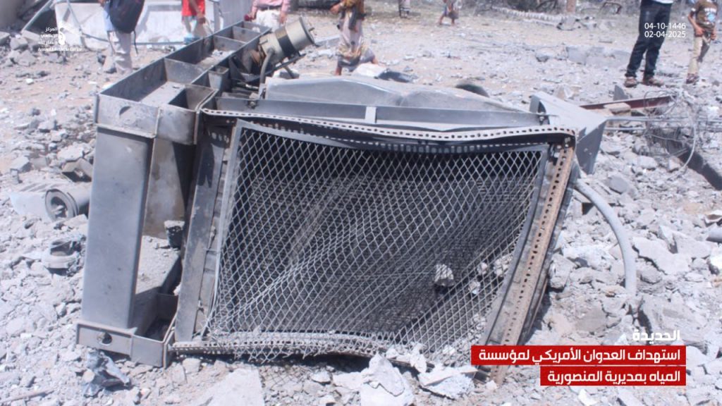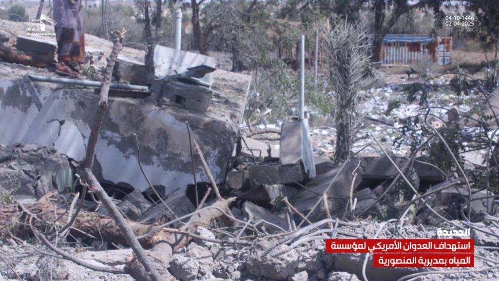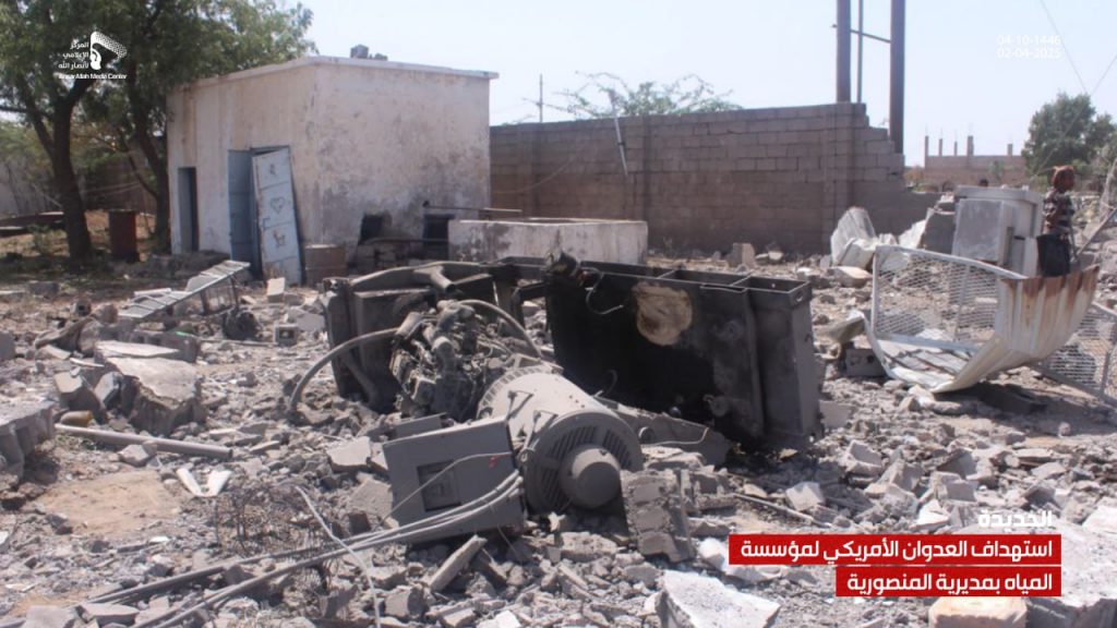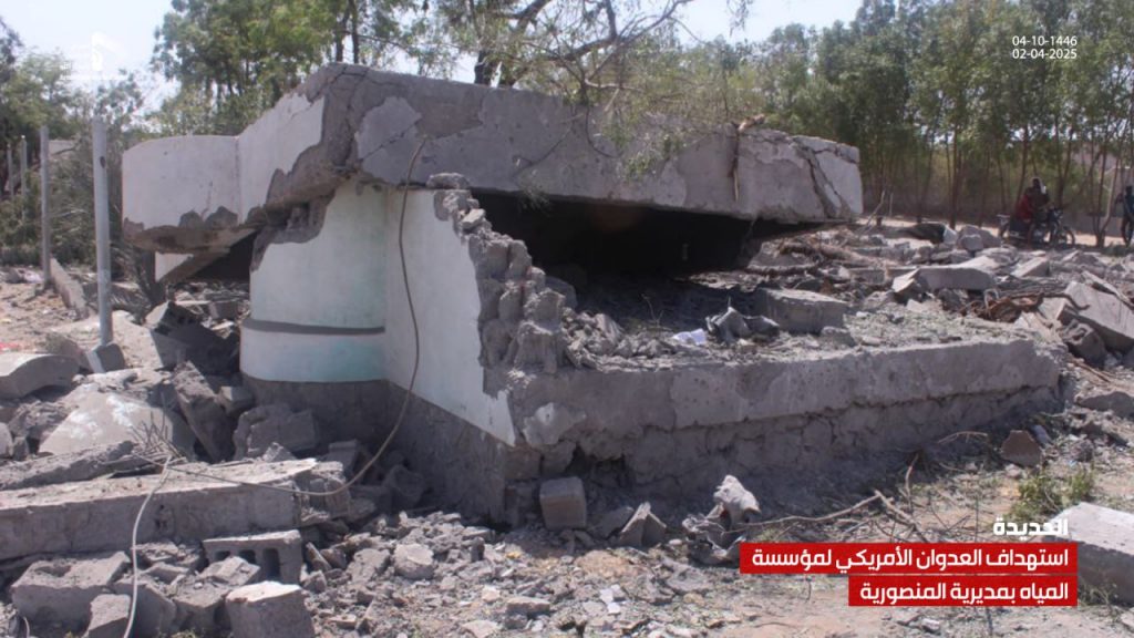 صور| جانب من الدمار الذي لحق بمشروع ومبنى مؤسسة المياه في مديرية المنصورية جراء العدوان الأمريكي On أبريل 2, 2025 Share يمني برس/ صور صور| جانب من الدمار الذي لحق بمشروع ومبنى مؤسسة المياه في مديرية المنصورية جراء العدوان الأمريكي – الحديدة 04-10-1446هـ | 02-04-2025م Share