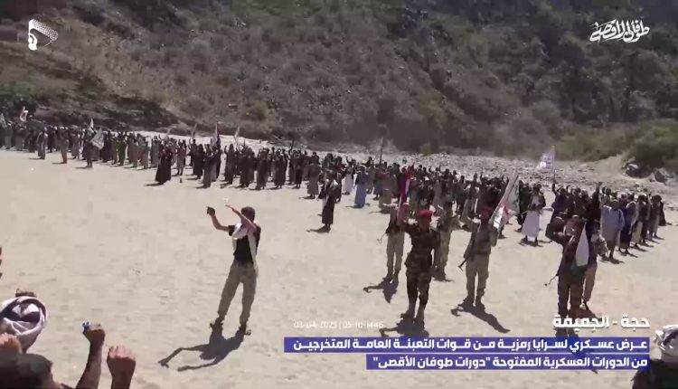 شاهد بالفيديو عرض عسكري لسرايا رمزية من قوات التعبئة العامة المتخرجين من الدورات العسكرية المفتوحة “دورات طوفان الأقصى” بمديرية #الجميمة في #حجة 05-10-1446 | 03-04-2025