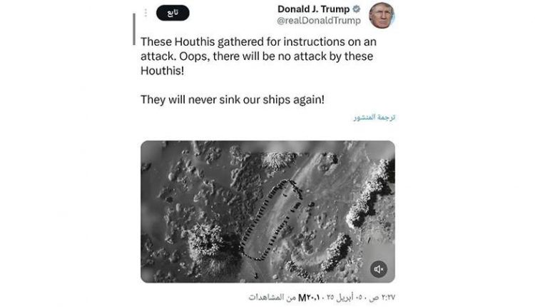إلى ذلك سخرت وسائل اعلام، على منشور ترامب، قائلة أنه وبعد أكثر من أسبوعين من الهجمات المكثفة بالأساطيل، والبوارج، وحاملات الطائرات، والقاذفات الاستراتيجية على اليمن، وتكلفة لا تقل عن مليار دولار على أقل تقدير، يخرج علينا ترامب عبر منصته الخاصة بمقطع في حدود خمس وعشرين ثانية، يُظهر فيه قصف مجموعة لا تتجاوز الثلاثين فردًا في اليمن، عُزّل من أي سلاح ثقيل أو متوسط!