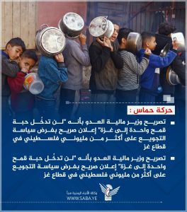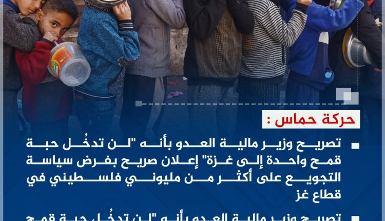 انفوجرافيك ـ حركة حماس: تصريح وزير مالية العدو بأنه “لن تدخُل حبة قمح واحدة إلى غزة” إعلان صريح بفرض سياسة التجويع على أكثر من مليوني فلسطيني في قطاع غزة