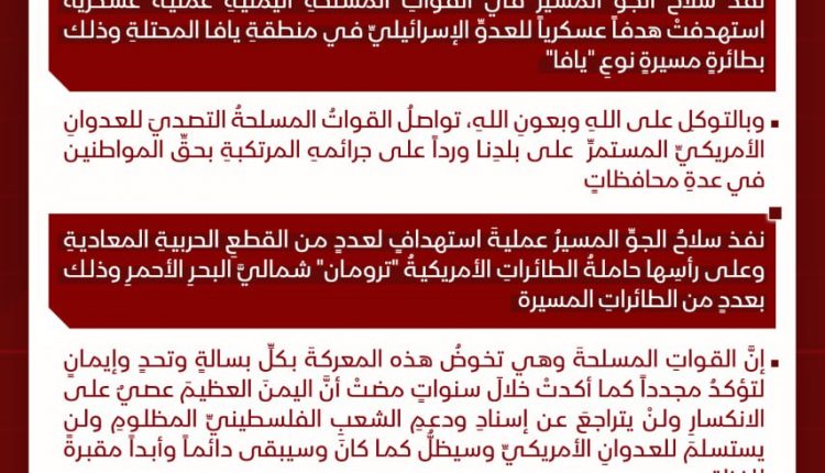 انفوجرافيك ـ بيان القوات المسلحة اليمنية بشأن استهداف “هدفا عسكريا” للعدو الإسرائيلي في منطقة يافا المحتلة، وعمليةَ استهدافٍ لعددٍ من القطعِ الحربيةِ المعاديةِ وعلى رأسِها حاملةُ الطائراتِ الأمريكيةُ “ترومان” شماليَّ البحرِ الأحمرِ – 9 أبريل 2025م