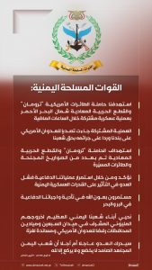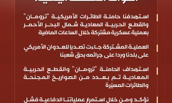 انفوجرافيك ـ بيان القوات المسلحة اليمنية بشان استهداف حاملة الطائرات الأمريكية “ترومان” والقطع الحربية المعادية شمال البحر الأحمر 13-10-1446هـ 11-04-2025م