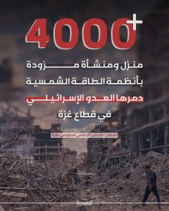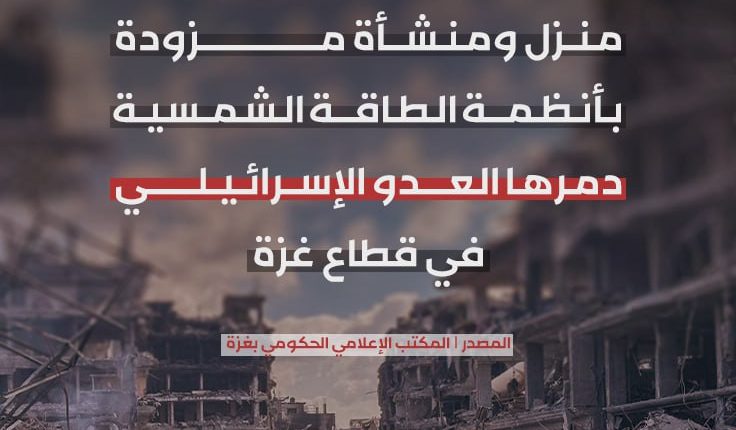 انفوجرافيك ـ المكتب الإعلامي الحكومي في غزة يعلن تدمير العدو الإسرائيلي لأكثر من 4000 منزل ومنشأة مزودة بأنظمة الطاقة الشمسية في القطاع
