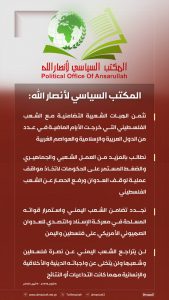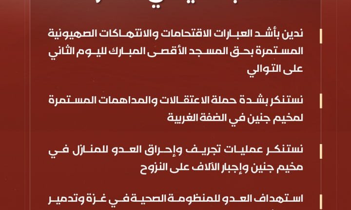 انفوجرافيك ـ المكتب السياسي لأنصار الله:ندين بأشد العبارات الاقتحامات والانتهاكات الصهيونية المستمرة بحق المسجد الأقصى المبارك لليوم الثاني على التوالي