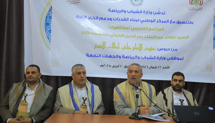 دشَّنت وزارة الشباب والرياضة، بالتنسيق مع المركز الوطني لبناء القدرات ودعم اتخاذ القرار، اليوم الأحد بصنعاء، البرنامج التدريبي من دروس قائد الثورة من عهد الإمام علي عليه السلام لمالك الأشتر.
