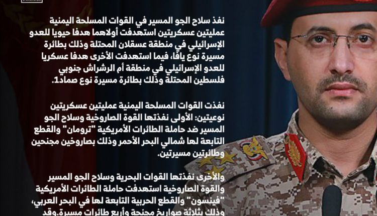 بيان قصف هدفين للعدو الإسرائيلي في عسقلان وأم الرشراش وحاملتي الطائرات ترومان وفيسنون
