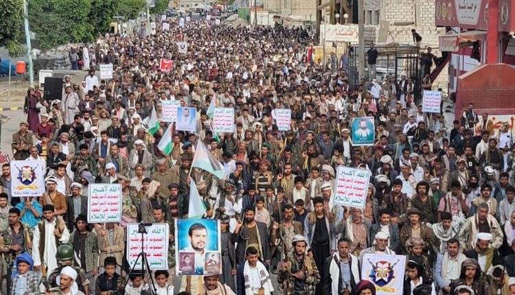 مسيرات حاشدة بمحافظة البيضاء تنديداً بجرائم العدوان الصهيوني والأمريكي
