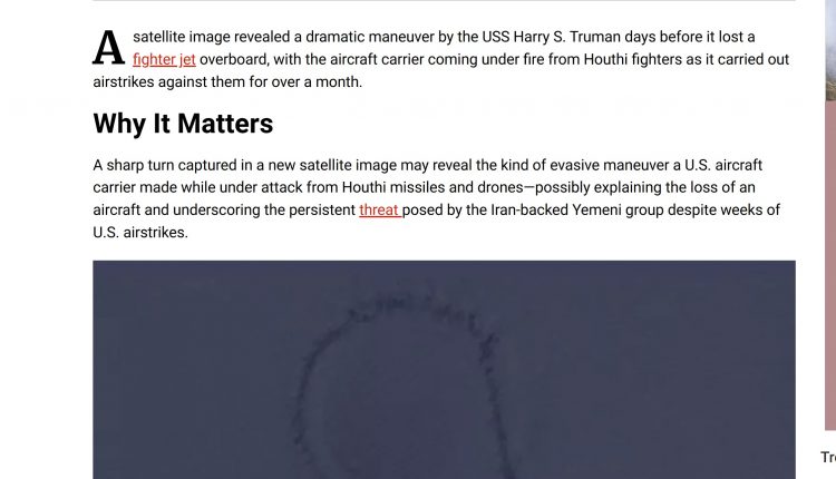 واستندت المجلة إلى الصورة التي التقطتها الأقمار الصناعية لمناورة دراماتيكية قامت بها حاملة الطائرات الأميركية هاري إس ترومان قبل أيام من سقوط طائرة مقاتلة في البحر، حيث تعرضت حاملة الطائرات لنيران مقاتلي الحوثيين أثناء تنفيذها غارات جوية ضدهم لأكثر من شهر. موضحة أن الصورة تكشف منعطفا حادا تم التقاطه في صورة جديدة للأقمار الصناعية عن نوع المناورة المراوغة التي قامت بها حاملة طائرات أمريكية أثناء تعرضها لهجوم من صواريخ وطائرات بدون طيار تابعة للحوثيين – مما قد يفسر فقدان طائرة ويؤكد التهديد المستمر الذي الحوثيون على الرغم من أسابيع من الضربات الجوية الأمريكية.