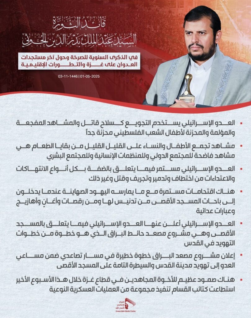 السيد القائد: العدو الإسرائيلي يستخدم التجويع كسلاح قاتل والمشاهد المفجعة والمؤلمة لأطفال الشعب الفلسطيني محزنة جداً (إنفوجرافيك)