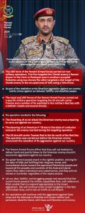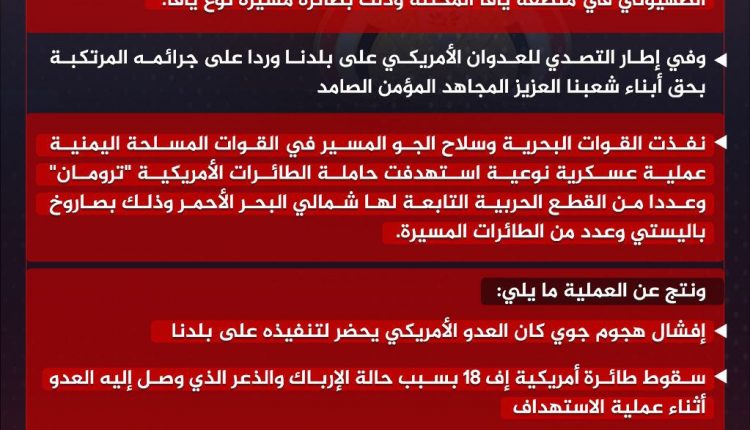 انفوجرافيك ـ بيان القوات المسلحة اليمنية بشأن تنفيذ عدد من العمليات العسكرية منها عملية استهدفت مطار رامون في منطقة أم الرشراش جنوبي فلسطين المحتلة وعملية استهدفت هدفا حيويا للعدو الإسرائيلي في منطقة يافا المحتلة، وعملية أخرى استهدفت حاملة الطائرات الأمريكية ترومان.