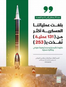 انفوجرافيك ـ بلغت عملياتنا المساندة منذ 15 رمضان إلى 9 ذو القعدة إلى أكثر من 131 عملية نُفذت بـ 253 صاروخًا باليستيًا ومجنحًا وفرط صوتي وطائرة مسيّرة