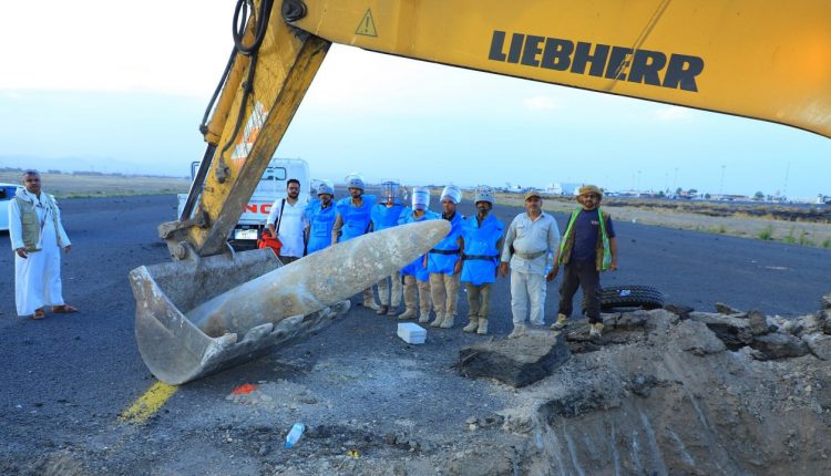 بالصور: استخراج صاروخ صهيوني كبير من مخلفات العدوان على مطار صنعاء الدولي