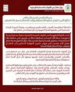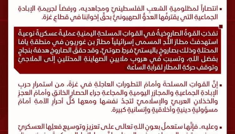 انفوجرافيك ـ بيان القوات المسلحة اليمنية بشأن استهداف مطار اللد “بن غوريون” في منطقة يافا المحتلة بصاروخ باليستي فرط صوتي حقق هدفه بنجاح بفضل الله – 15 مايو 2025م
