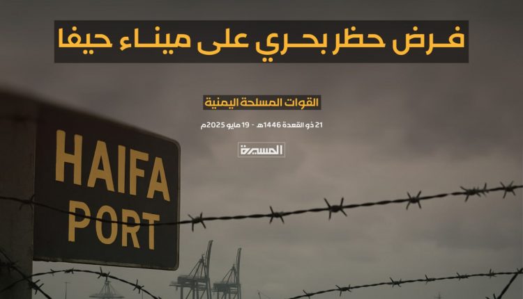 القوات المسلحة اليمنية تعلن بدء فرض حظر بحري على ميناء حيفا القوات المسلحة اليمنية تعلن بدء فرض حظر بحري على ميناء حيفا On مايو 20, 2025 Share يمني برس | القوات المسلحة اليمنية: نقرر بالتوكل على الله تنفيذ توجيهات القيادة بدء العمل على فرض حظر بحري على ميناء #حيفا Share