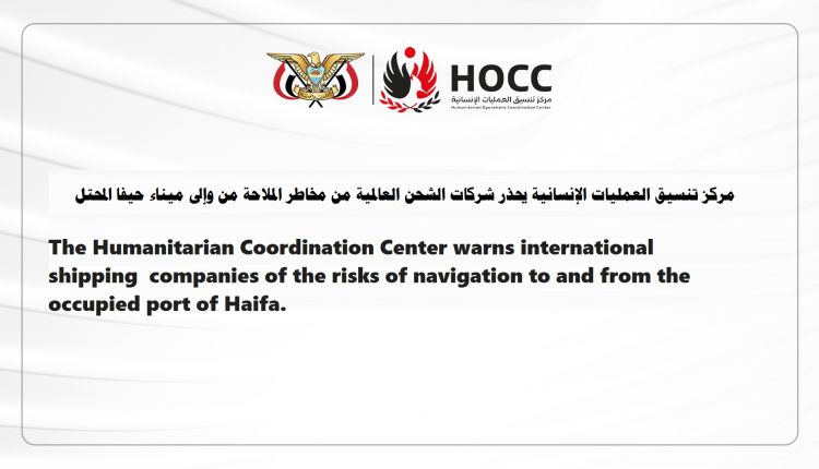 أصدر مركز تنسيق العمليات الإنسانية HOCC قرارًا بفرض حظر شامل على حركة الملاحة البحرية من وإلى ميناء حيفا المحتل وذلك بموجب إعلان القوات المسلحة اليمنية بتاريخ 19 مايو 2025 بفرض حظر بحري على الميناء رداً على تصعيد كيان الاحتلال لمجازرة النازية بحق المدنيين في غزة.