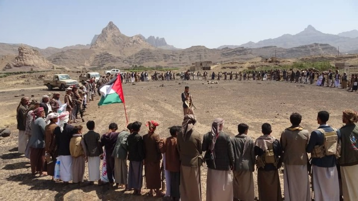 ورفع المشاركون في مسيرات راجلة ووقفات قبلية مسلحة غاضبة في عزل سعوان والرونة مديرية بني حشيش، وقروى مديرية جحانة وقروى العليا مديرية الطيال، وتوعر مديرية الحصن، وبني جرين وبني إسحاق مديرية صعفان، والمخلاف وضابي والمحيام والحطب والصوفة وبيت العليي والأعروش والربع مديرية الحيمة الخارجية، وغربي مسار مديرية مناخة، العلمين اليمني والفلسطيني وشعار البراءة من أعداء الله.