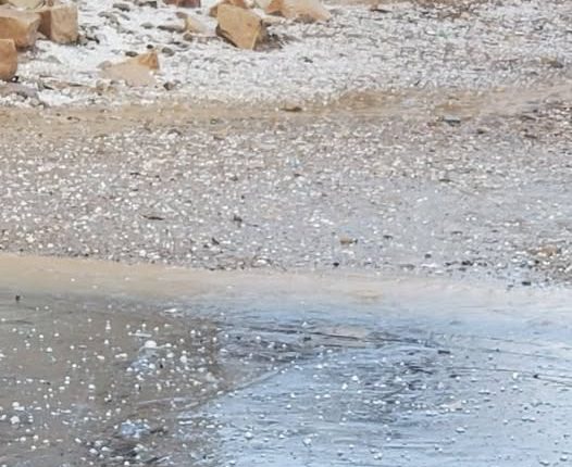 وتعد هذه الظاهرة نادرة الحدوث في المنطقة، إذ أظهرت الصور المتداولة كميات كبيرة من حبات البرد الضخمة، والتي قد تشكل خطرا مباشرا على حياة المواطنين في حال سقوطها بشكل مباشر.