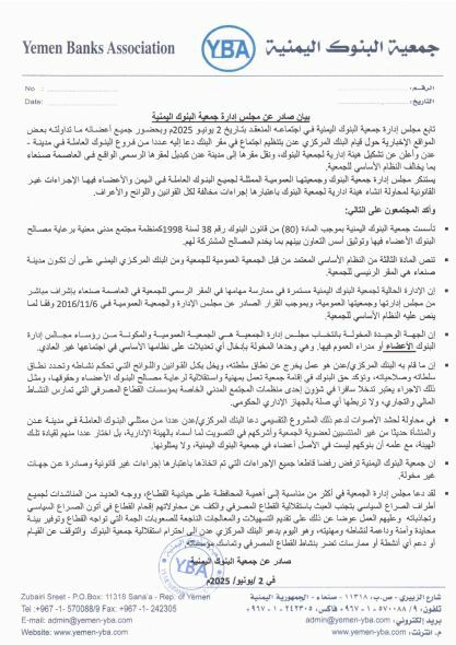 وختم مجلس الإدارة بيانه بالتأكيد على رفضه القاطع لتلك الإجراءات، داعياً البنك المركزي – عدن إلى احترام استقلالية جمعية البنوك اليمنية، والتوقف الفوري عن أي خطوات أو ممارسات من شأنها المساس بالقانون والنظام المؤسسي للقطاع المصرفي.