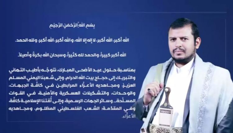 أصدر قائد الثورة السيد عبد الملك الحوثي مساء اليوم الخميس 9 ذو الحجة بياناً هاماً بمناسبة عيد الأضحى المبارك هنأ في شعبنا اليمني العزيز والقوات المسلحة اليمنية والأمن وحجاج بيت الله الحرام وكافة شعوب الأمة الإسلامية بمناسبة حلول العيد ..