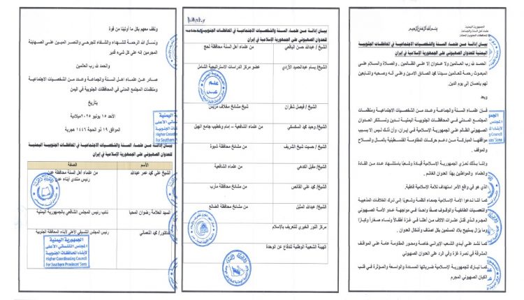 كما بارك الموقعون على البيان للجمهورية الإسلامية الإيرانية ما وصفوه بـ”الضربات المسددة والمؤثرة” التي استهدفت عمق الكيان الصهيوني، مؤكدين وقوفهم الكامل معها في معركة الأمة العادلة ضد الغطرسة الصهيونية.