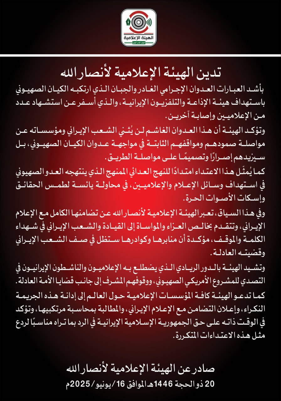 دانت الهيئة الإعلامية لأنصار الله، بأشد العبارات، الجريمة الغادرة التي ارتكبها الكيان الصهيوني باستهداف هيئة الإذاعة والتلفزيون الإيرانية، والتي أسفرت عن استشهاد عدد من الإعلاميين وإصابة آخرين.