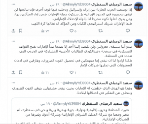 وختم الرميلي منشوره بسؤال مرير حمل في طياته أمنية: “من يدري، لعلّ اتساع رقعة الحرب بين إيران والكيان الصهيوني يمنح سقطرى مخرجًا من هذا الاحتلال البغيض… لعلّ النار التي أشعلتها الإمارات هناك تعود لتفضح شراكتها الاستراتيجية مع الكيان الصهيوني”.