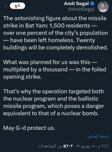 كشفت تغريدة نشرها كبير المحللين السياسيين في القناة 12 الإسرائيلية، “أميت سيغال”، عن حجم الدمار الهائل الذي خلفه صاروخ واحد فقط في مدينة بات يام المحتلة، مشيراً إلى أن الضربة أدت إلى تشريد نحو 1500 مستوطن، أي ما يزيد عن واحد في المائة من سكان المدينة، فضلاً عن تدمير عشرين مبنى سكنيًا بشكل كامل.