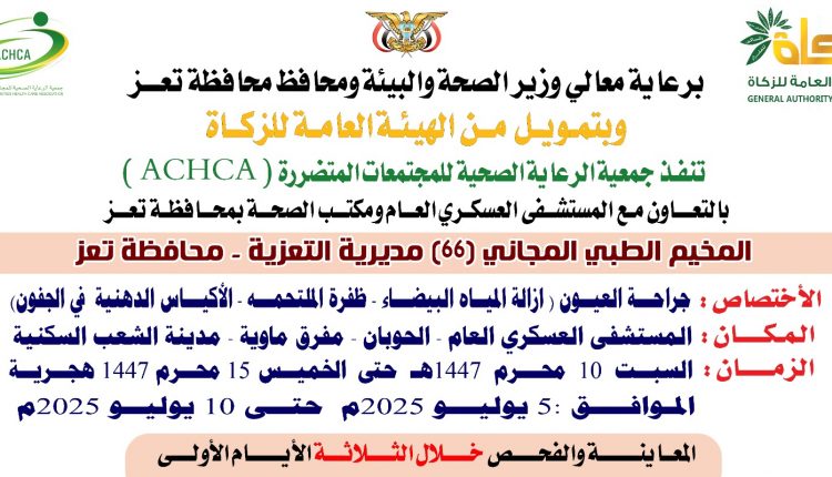 من المقرر أن تدشن جمعية الرعاية الصحية للمجتمعات المتضررة غداً السبت 10 محرم بالمستشفى العسكري العام بمديرية التعزية في محافظة تعز المخيم الطبي المجاني الـ(66) لجراحة العيون.
