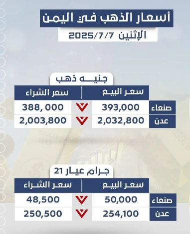ففي العاصمة صنعاء، سجّل سعر الجنيه الذهب انخفاضًا إلى 393,000 ريال للبيع و388,000 ريال للشراء. كما تراجع سعر جرام الذهب عيار 21 إلى 50,000 ريال للبيع و48,500 ريال للشراء.