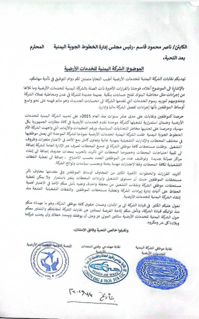 في بيان وُزّع على وسائل الإعلام ومواقع التواصل الاجتماعي، أصدرت نقابات الشركة اليمنية للخدمات الأرضية بعدن بيانًا رسميًا موجّهًا إلى رئيس مجلس إدارة الخطوط الجوية اليمنية، دعت فيه إلى إعادة النظر في القرارات الأخيرة، التي وصفتها بالمفاجئة، محذّرة من أنها قد تؤدي إلى تقسيم وفصل الشركة ماليًا وإداريًا.