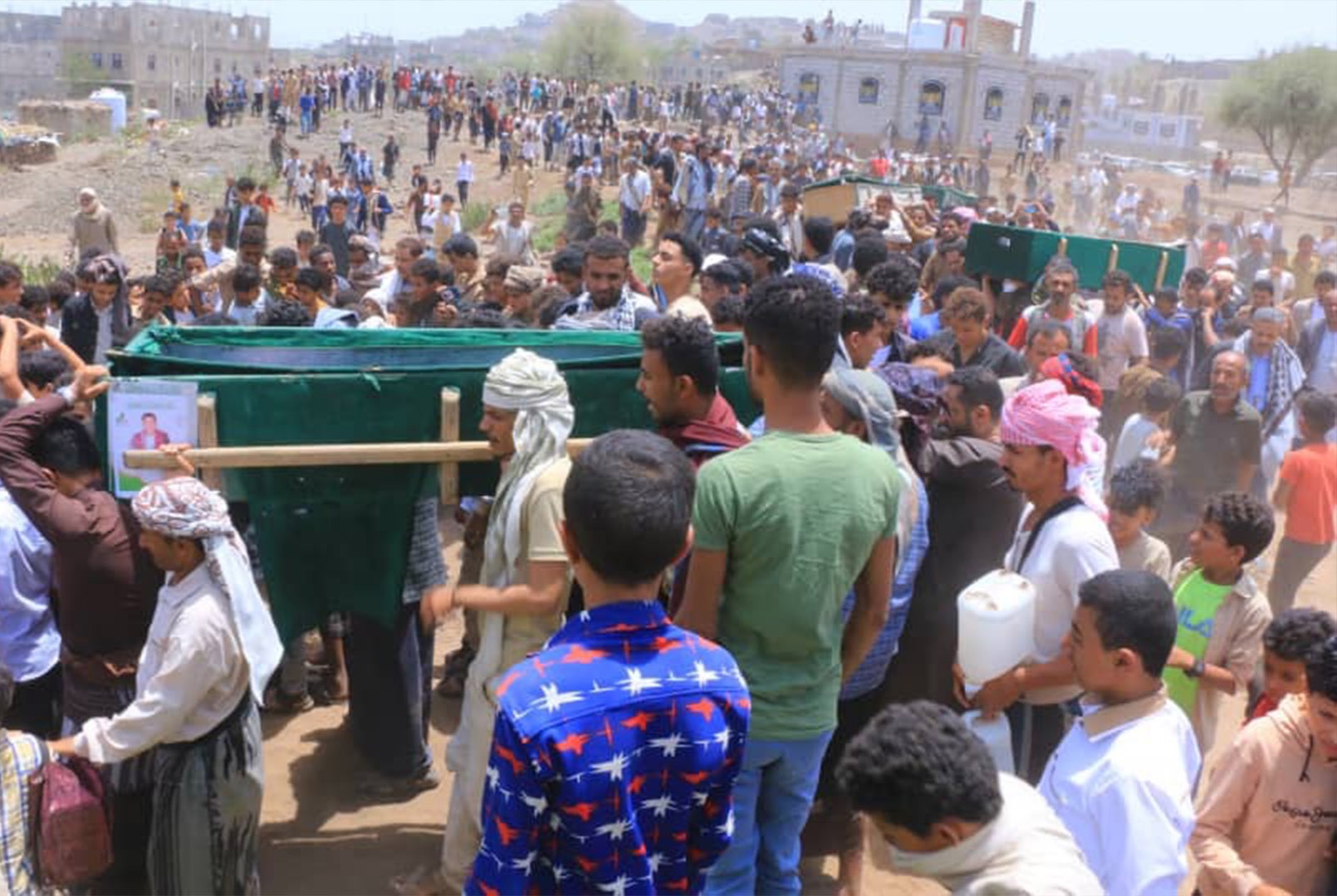 وفي مشهد مؤلم، شيّع أهالي محافظة تعز اليوم جثامين الخمسة الأطفال الذي استشهدوا أثناء لعبهم كرة القدم، إثر سقوط قذيفة هاون أطلقتها ميليشيا حزب الإصلاح المدعومة من التحالف على منطقة العرصوم بعزلة الهشمة في مديرية التعزية الأسبوع الماضي.