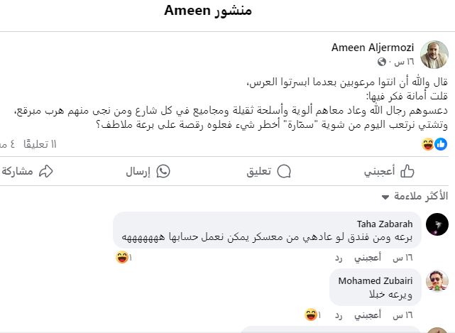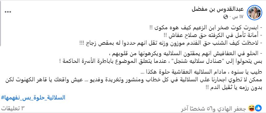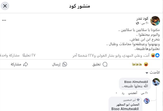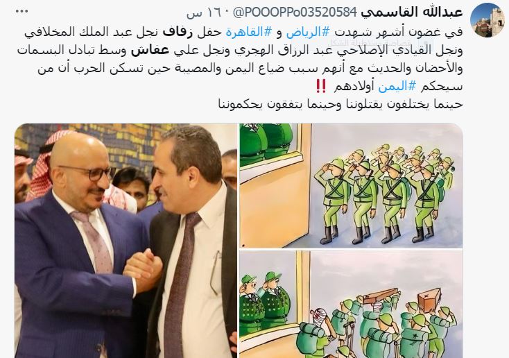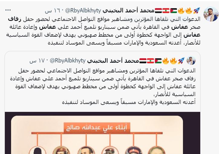 وما تزال المنشورات والتغريدات تتداول بكثافة ، مع استمرار التفاعل على شبكات التواصل الاجتماعي، في مؤشر واضح على حجم الغضب الشعبي من محاولة تلميع هذه الأسرة، التي يحاول الإماراتيون والأمريكيون تصويرها على أنها الحل لليمنيين، بينما هي في الواقع غطاء لعودة الوجود الأمريكي إلى اليمن والسيطرة عليه في خدمة للعدو الصهيوني لمحاولة يائسة  لوقف الاسناد اليمني لغزة .