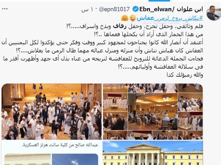 يمني برس | ضجت مواقع التواصل الاجتماعي بالسخرية من مشاهد الفيديو التي نشرها إعلام أسرة عفاش المدعومة من الإمارات خلال زفاف نجل الرئيس السابق علي عبدالله صالح الملقب بـ”عفاش” واخرين ، وسط موجة انتقادات حادة من اليمنيين الذين يرفضون محاولات تلميع وتنظيف من تلطخت أيديهم بالفساد والإجرام في اليمن .