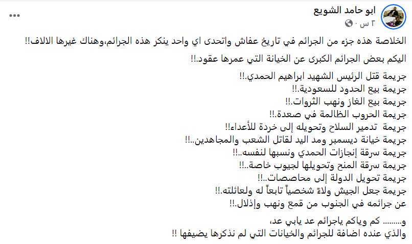 وعبّر الكثيرون في الشمال والجنوب عبر منشوراتهم عن استهجانهم، مستذكرين جرائم النظام السابق وممارسات الفساد التي ارتبطت باسم أسرة صالح خلال سنوات حكمها الطويلة.