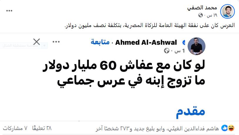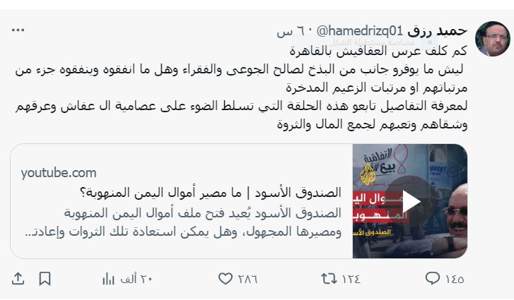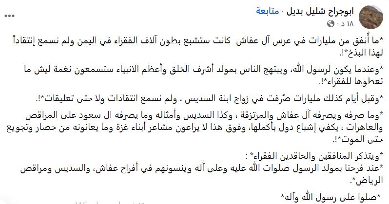 كما أثار رواد مواقع التواصل الاجتماعي جدلاً واسعًا، متسائلين عن سبب مهاجمة القنوات الممولة من عفاش، والممولة بدورها من السعودية والإمارات، للاحتفالات بمولد النبي محمد صلى الله عليه وسلم بحجة توجيه الأموال للفقراء والمساكين، وهي احتفالات بسيطة التكاليف، في الوقت الذي تُغضّ فيه هذه القنوات الطرف عن موائد الزفاف الفخمة لأسرة عفاش، والتي تشكل جزءًا بسيطًا مما تم نهبه من خيرات اليمن خلال عقود حكمهم، ولاتي تحولت إلى استثمارات تدر ملايين الدولارات على الأسرة نفسها.