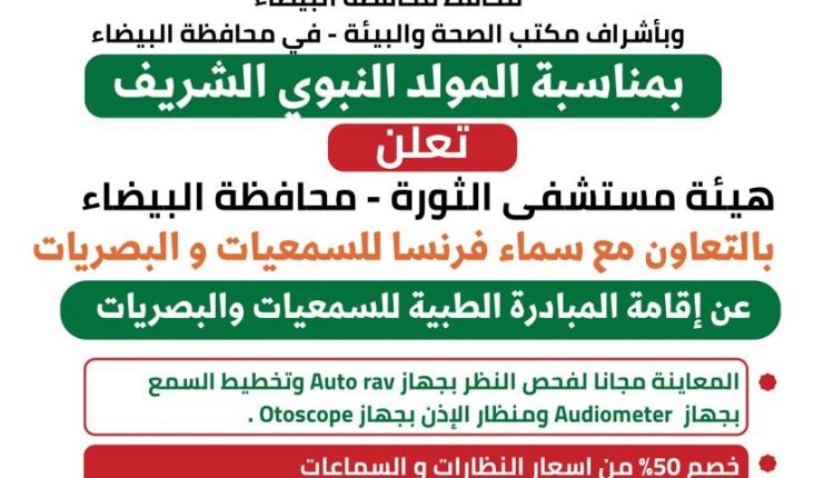 يمني برس | تنفذ هيئة مستشفى الثورة العام بمدينة البيضاء، مبادرة طبية مجانية في مجالي البصريات والسمعيات، وذلك بالتزامن مع ذكرى المولد النبوي الشريف.