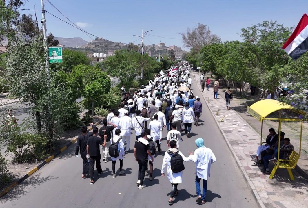 وانطلق المسير من ساحة كلية اللغات مروراً بكلية التربية وصولاً إلى ساحة العرض خلف كلية الهندسة، حاملين العلمين اليمني والفلسطيني ومرددين شعارات نصرة الشعب الفلسطيني والهتافات المنددة بمجازر الاحتلال الصهيوني.