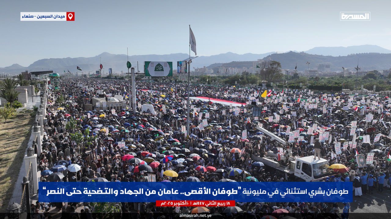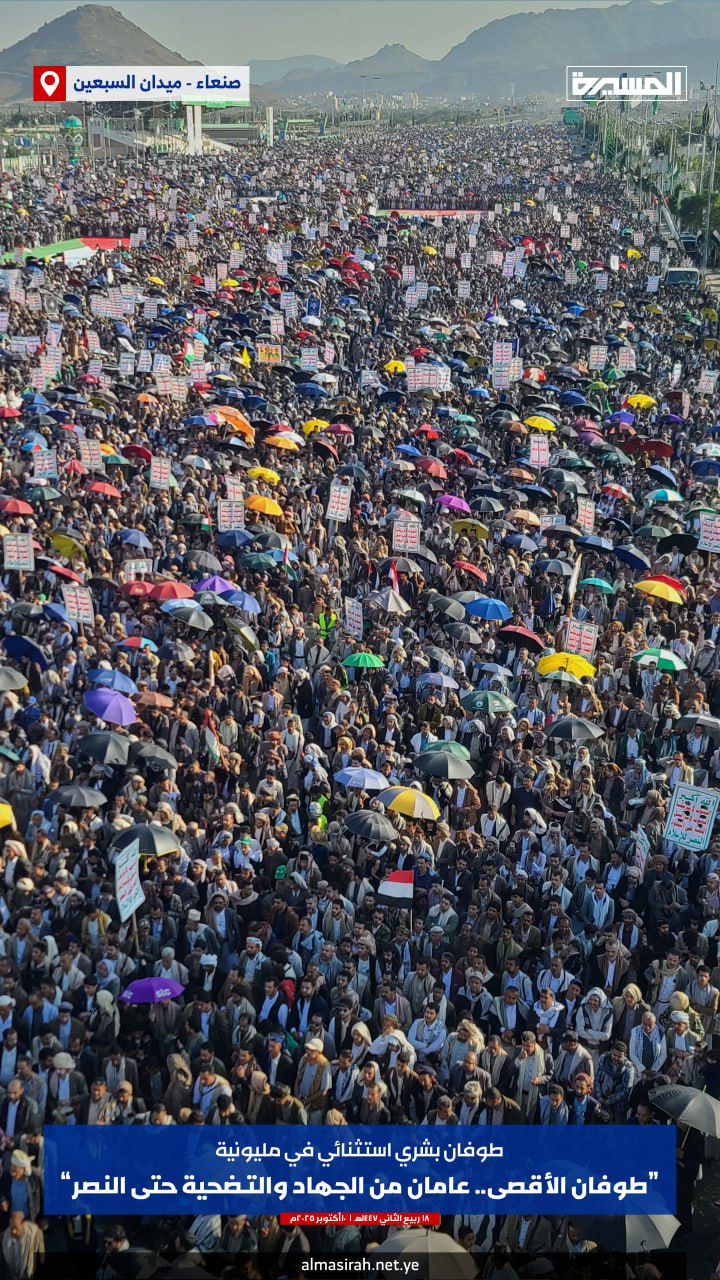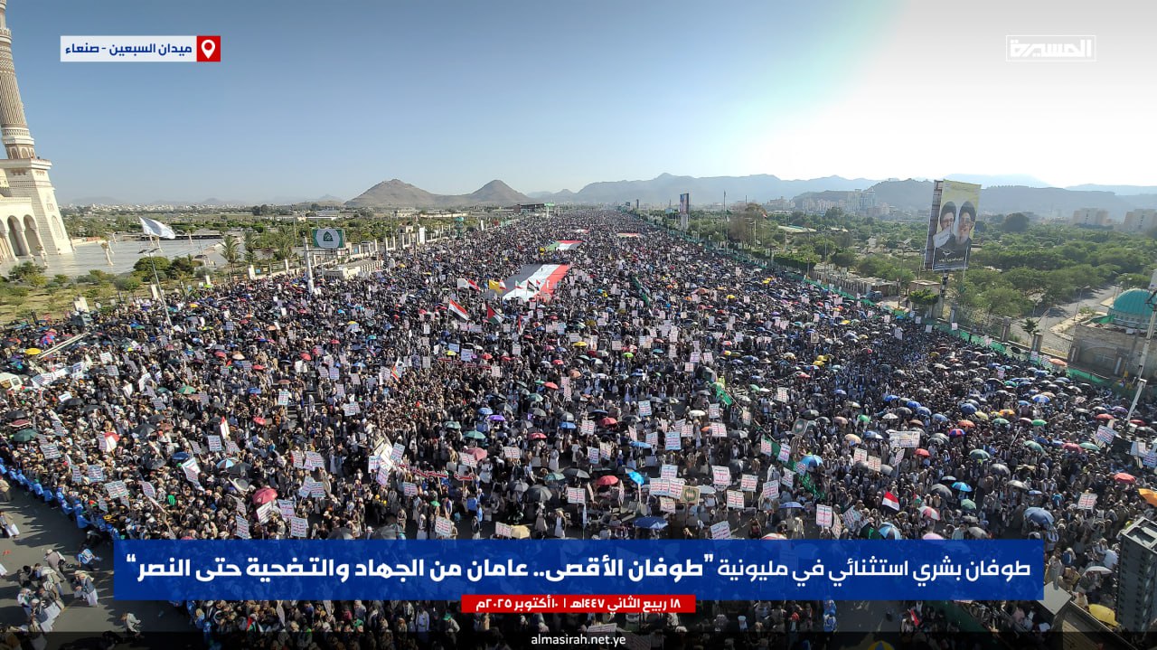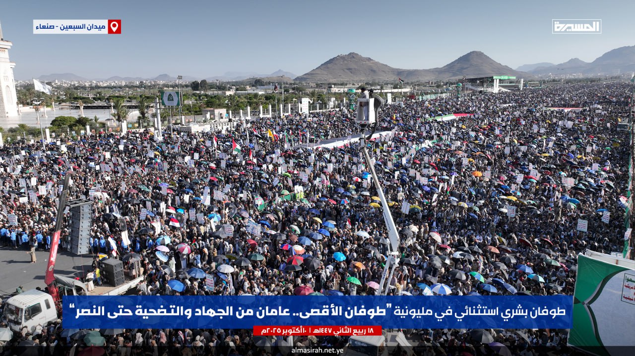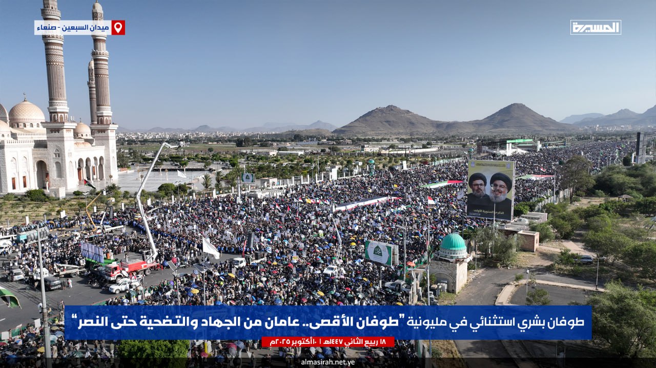 شاهد .. صور أولية من الحشود المليونية الضخمة في ميدان السبعين بالعاصمة صنعاء On أكتوبر 10, 2025 Share يمني برس || صنعاء: طوفان بشري استثنائي في مليونية (طوفان الأقصى.. عامان من الجهاد والتضحية حتى النصر) بـ #ميدان_السبعين في #صنعاء حشود ضخمةصنعاءطوفان الاقصى Share