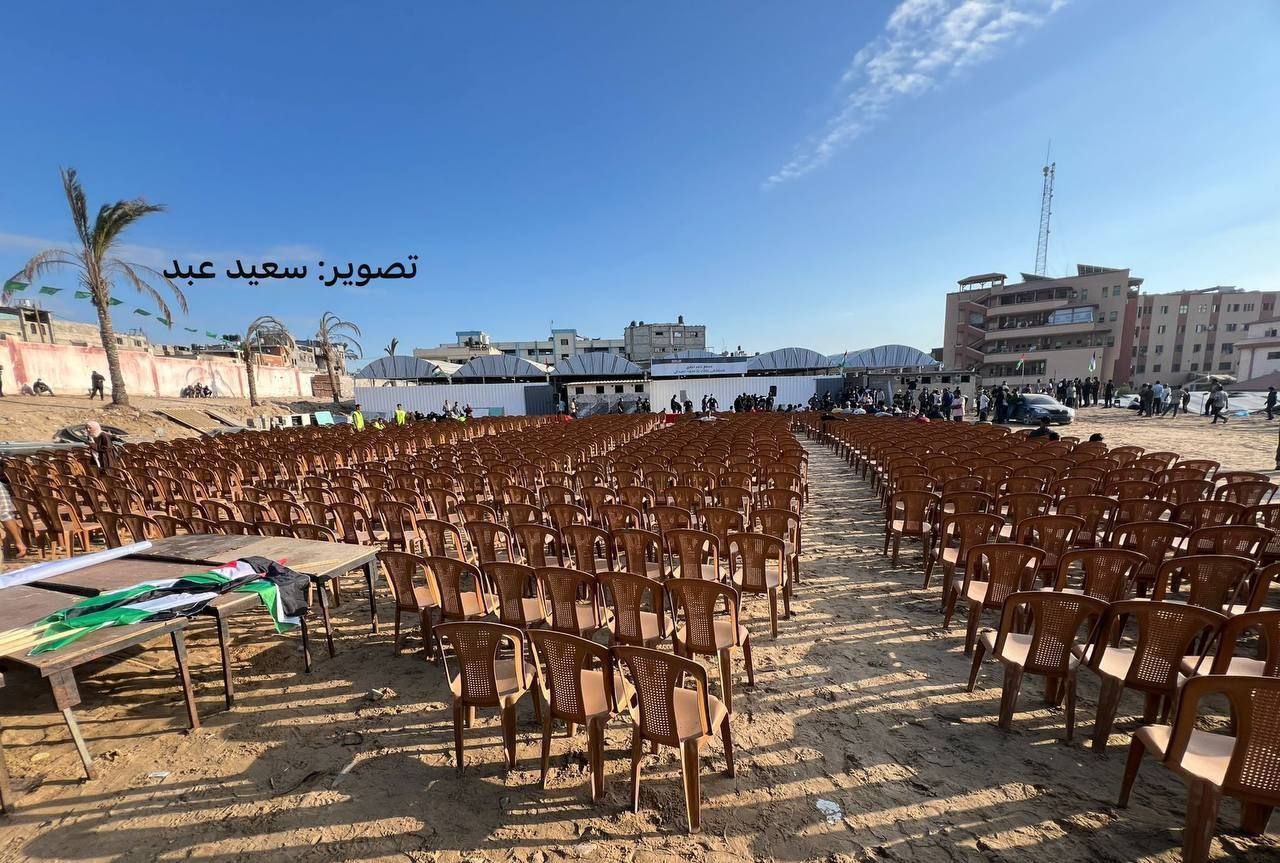 تشهد منطقة ساحة مجمع ناصر الطبي في مدينة خان يونس جنوب قطاع غزة استعدادات كبيرة لاستقبال نحو 2000 أسير فلسطيني محرراً من سجون الاحتلال الصهيوني اليوم ..