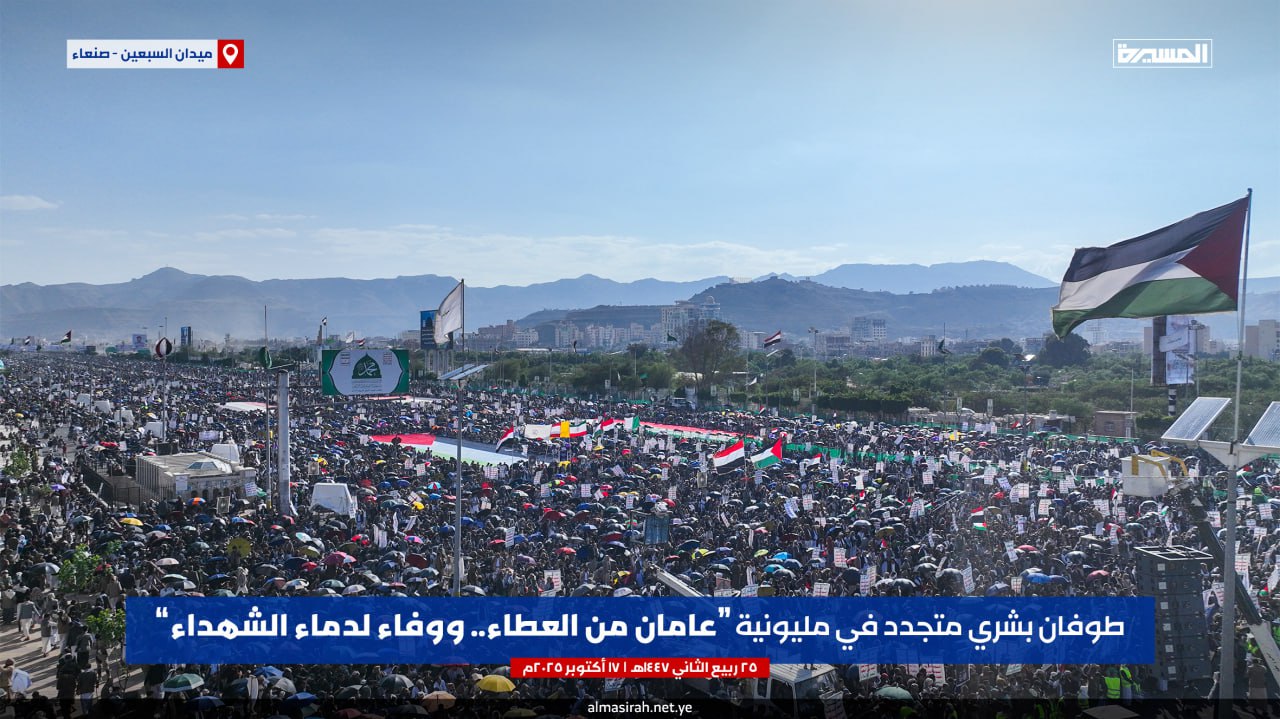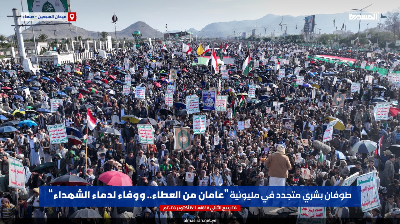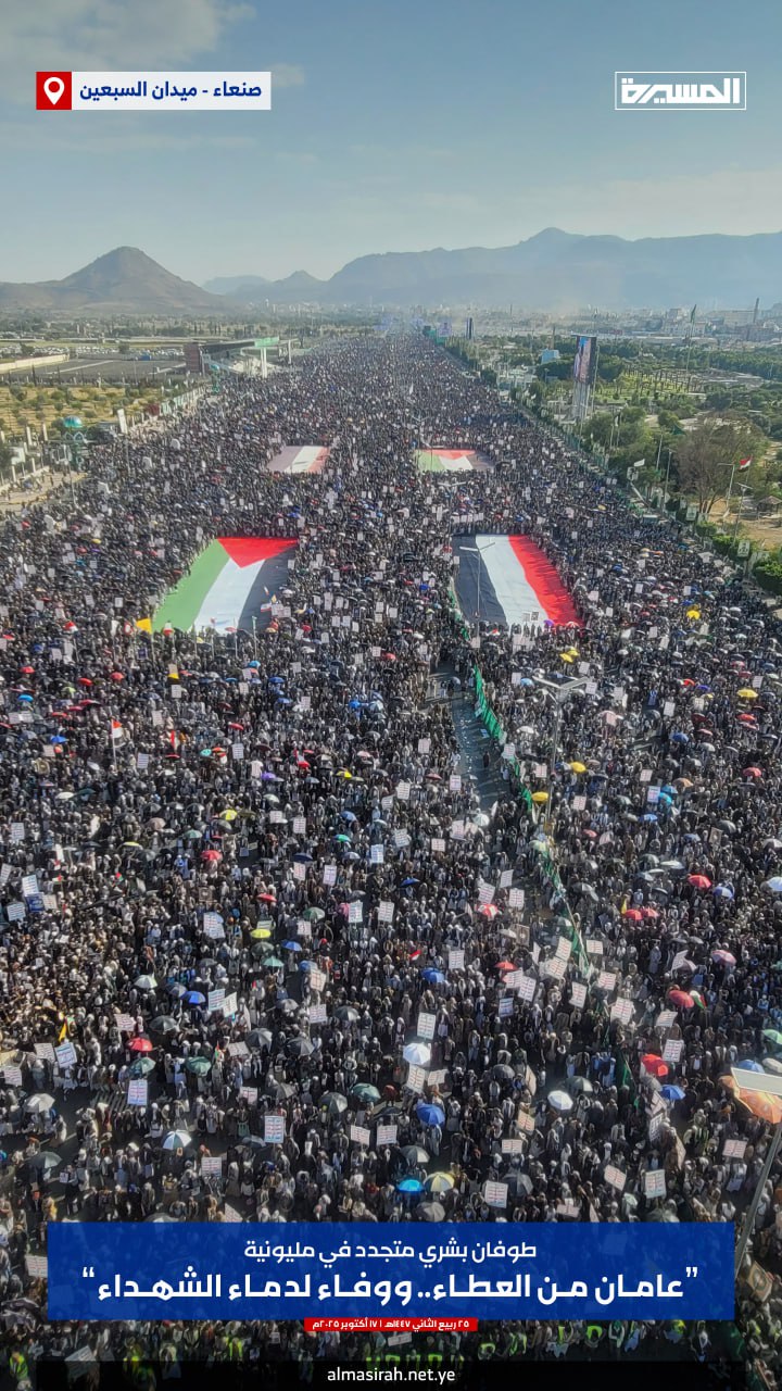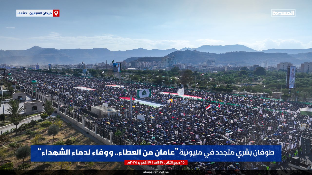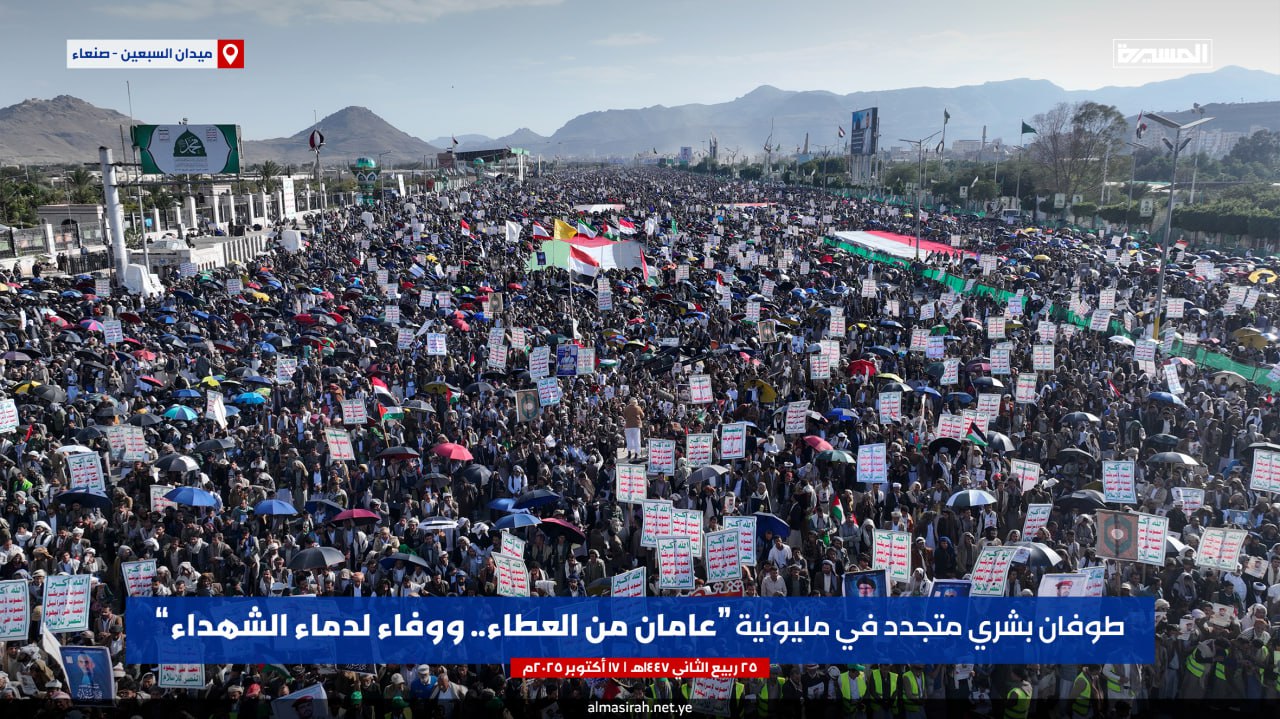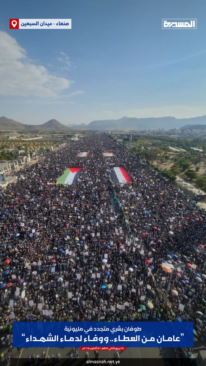 اكتظ ميدان السبعين بالعاصمة صنعاء عصر اليوم الجمعة 25 ربيع الأول بحشود ملبيونية هي الأضخم من نوعها استجابة لدعوة قائد الثورة السيد عبد الملك الحوثي حفظه الله للخروج في مسيرات عامان من الصمود ووفاء لدمار الشهداء..
