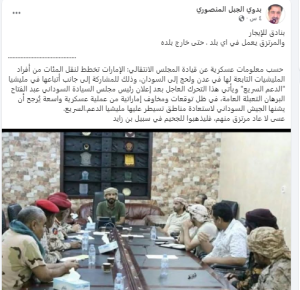 وأكد الكاتب السياسي الجنوبي “بدوي الجبل المنصوري” في منشور له على منصة “فيسبوك”، أنه حصل على معلومات عسكرية موثوقة تفيد بأن قيادة القوات الإماراتية تخطط لنقل المئات من عناصر الانتقالي في عدن ولحج، للقتال إلى جانب قوات “الدعم السريع” التي يقودها “محمد حمدان دقلو”، المعروف بـ “حميدتي”.
