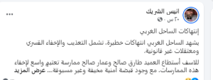 وأوضح في منشور آخر، أن ما يحدث داخل المعتقلات غير القانونية في الساحل الغربي، هو انتهاكات خطيرة تشمل التعذيب والاختفاء القسري.