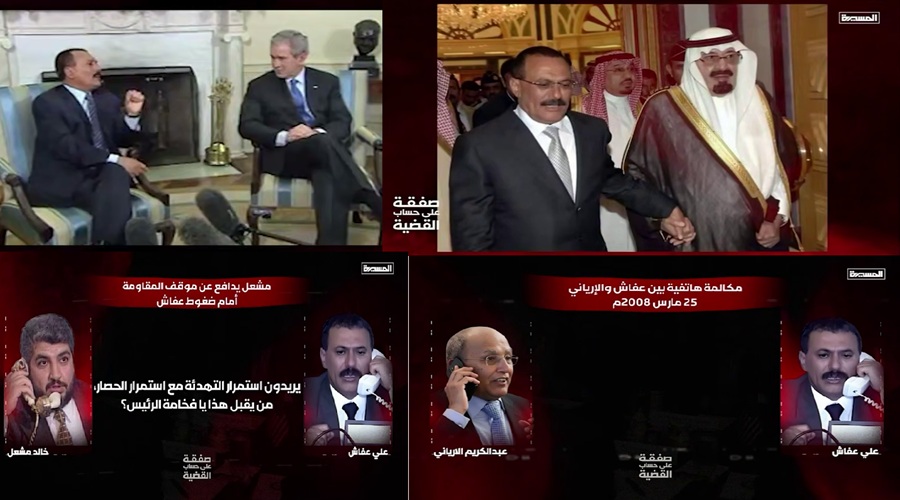 وكشفت القناة عبر تحقيقها الاستقصائي، لأول مرة، تسجيلات صوتية ووثائق رسمية تزيح الستار عن حقبة ما قبل ثورة 21 سبتمبر 2014م، وكيف تحول نظام الخائن عفاش إلى أداة لكسر عزلة الكيان الصهيوني. ومن بين هذه التسجيلات مكالمات هاتفية للخائن عفاش، تم الكشف فيها عن القناع الحقيقي للرئيس الذي ظل يلمع نفسه على حساب القضية الفلسطينية، ويقدم نفسه كفارس لا مثيل له بين العرب.