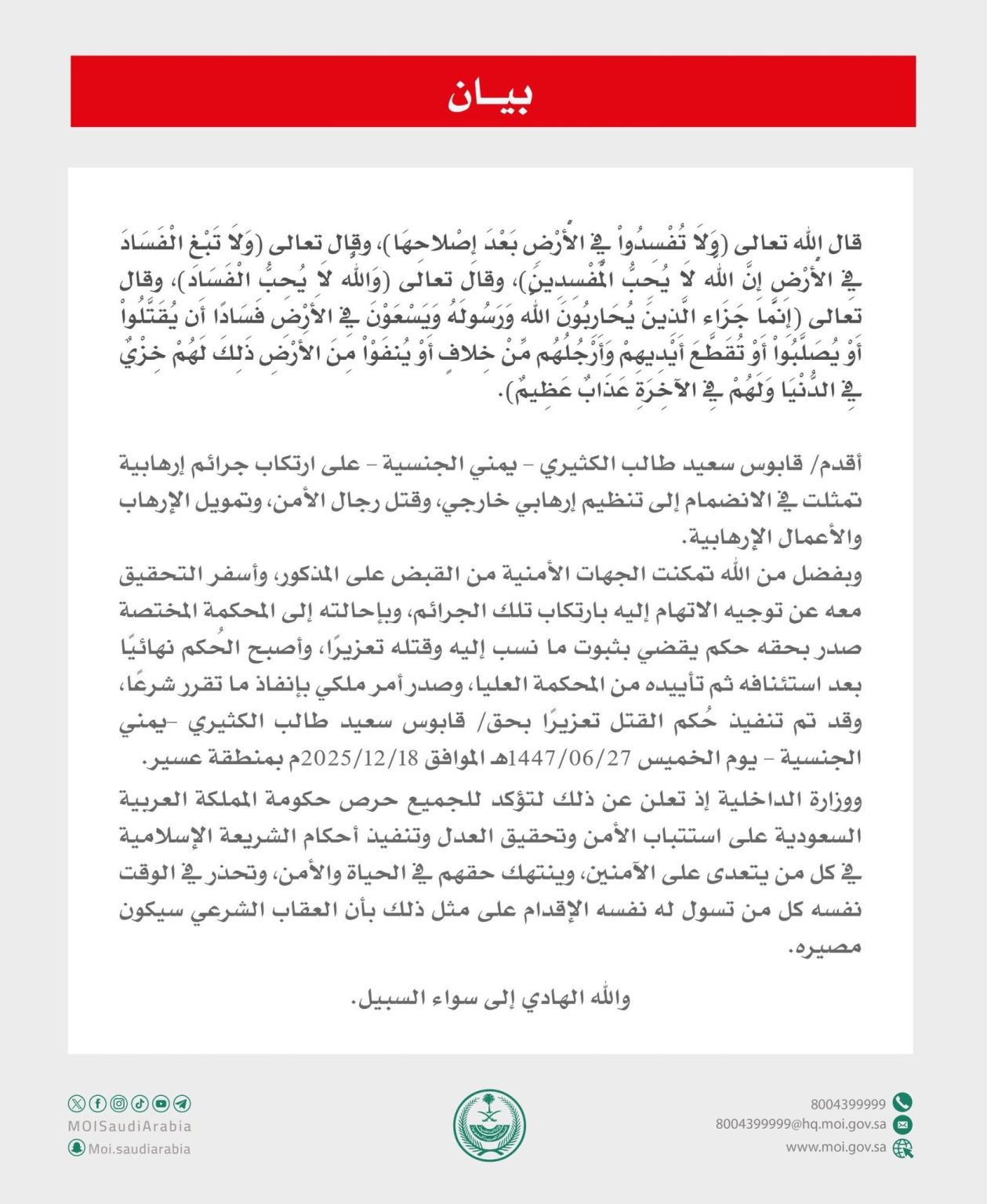 يمني برس | أعلنت السلطات السعودية، اليوم الخميس، تنفيذ حكم الإعدام بحق المواطن اليمني قابوس سعيد طالب الكثيري، بعد القبض عليه في حضرموت ونقله إلى الأراضي السعودية، بتهمة ارتكاب جرائم إرهابية.