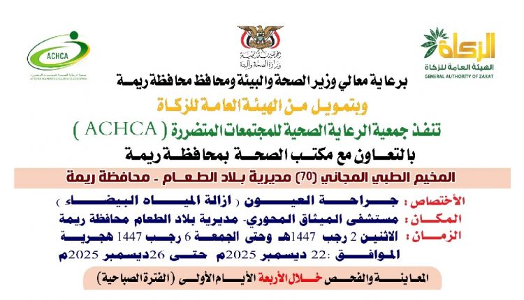 تدشن جمعية الرعاية الصحية للمجتمعات المتضررة، غداً الإثنين 2 رجب ، المخيم الطبي المجاني الـ 70 لجراحة العيون في مستشفى الميثاق المحوري بمديرية بلاد الطعام محافظة ريمة.