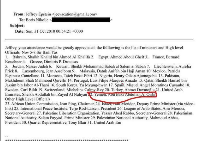 من بين الوثائق التي تم الكشف عنها، برز محضر اجتماع يعود لعام 2010، أي قبل أشهر قليلة من اندلاع ثورة فبراير في اليمن، هذا الاجتماع شهد مشاركة وزير الخارجية الأسبق، أبو بكر القربي، وهو ما يضع تساؤلات حول طبيعة هذا الاجتماع ومحاوره، خاصة في ظل الكشف عن ارتباطات إبستين المشبوهة، إن وجود اسم القربي في هذه الوثائق يشير إلى أن النظام اليمني السابق كان على دراية، أو ربما متورطاً، في شبكة إبستين المعقدة.