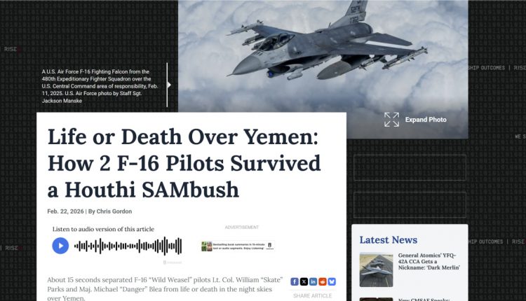 وفي تقرير مطول، قالت المجلة إن طيارَي طائرات إف-16 “وايلد ويسل”، المقدم ويليام “سكيت” باركس والرائد مايكل “دينجر” بليا، كانا على بعد 15 ثانية فقط من الموت المحقق، بعد أن تحول مطاردوه إلى هدف لصاروخ أرض-جو يمني خلال مهمة ليلية في 27 مارس 2025.