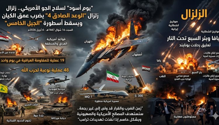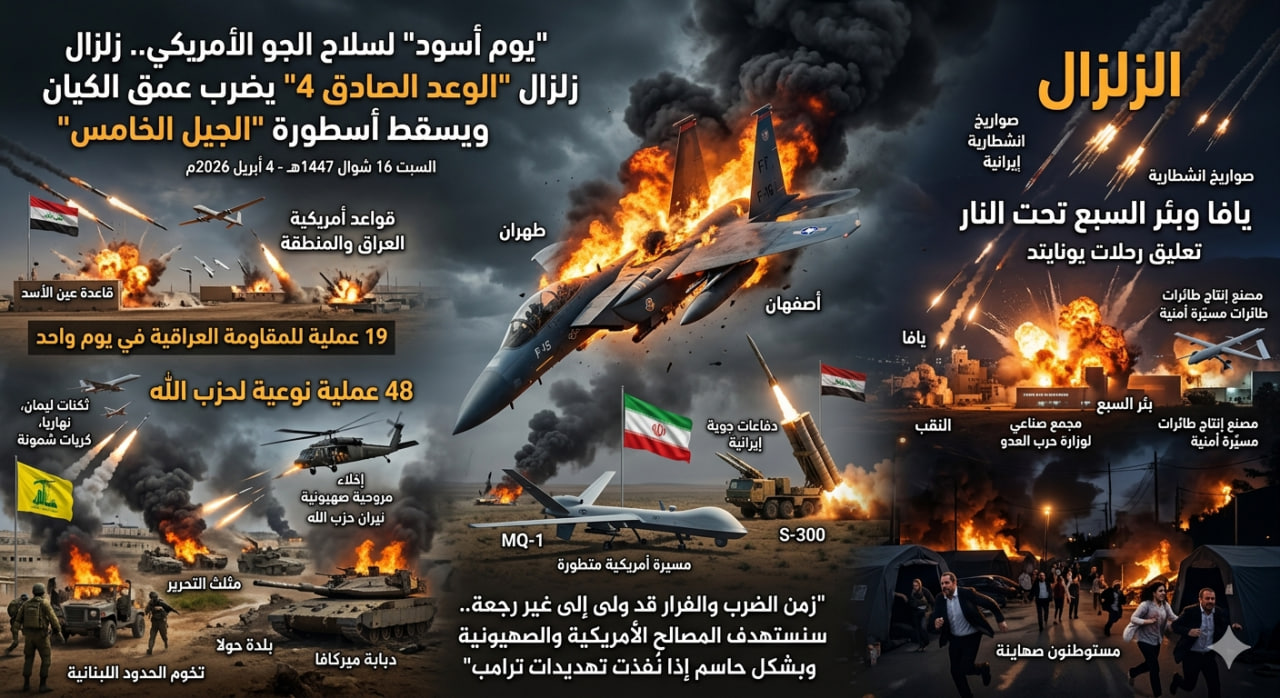 في تحول دراماتيكي غيّر موازين القوى في المنطقة، سجلت الساعات الماضية من اليوم السبت 4 أبريل 2026 الموافق 16 شوال انكساراً تاريخياً للتكنولوجيا العسكرية الغربية أمام ضربات محور المقاومة.